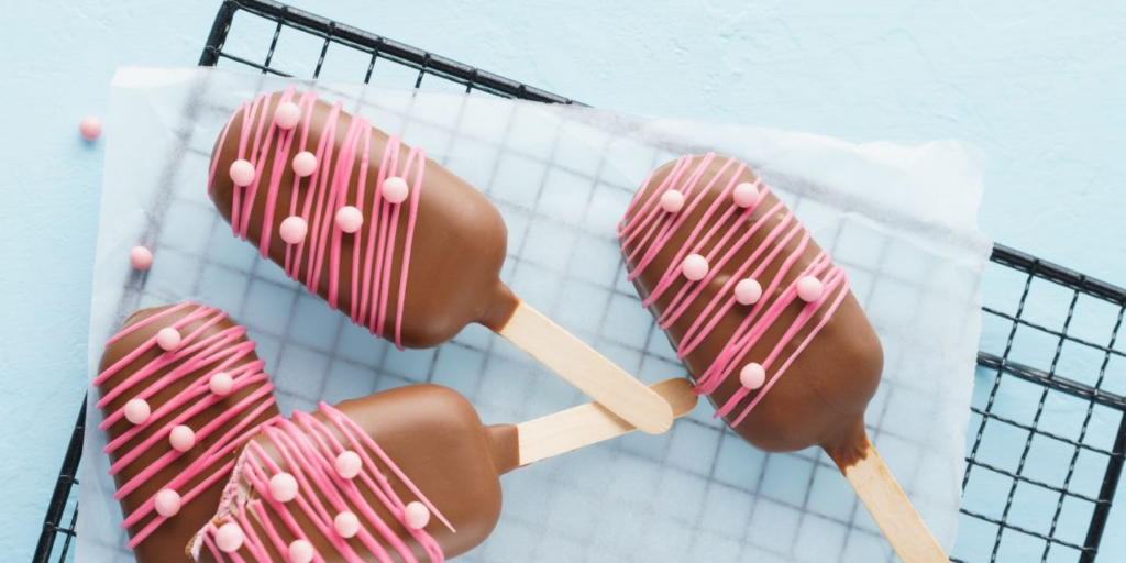 Этот вариант для тех, кто хочет присоединиться к празднику, но предпочитает выпечку, а не мороженое. Миниатюрные пирожные на палочке выглядят эффектно, а по сути представляют собой бисквитную основу, скрепленную кремом и покрытую глазурью.