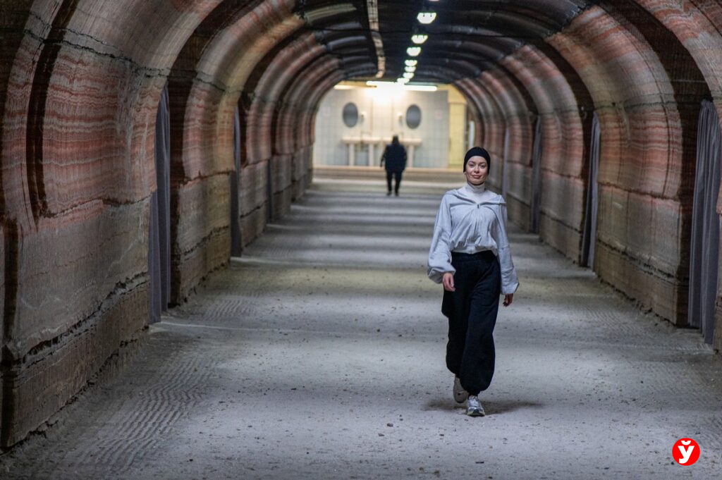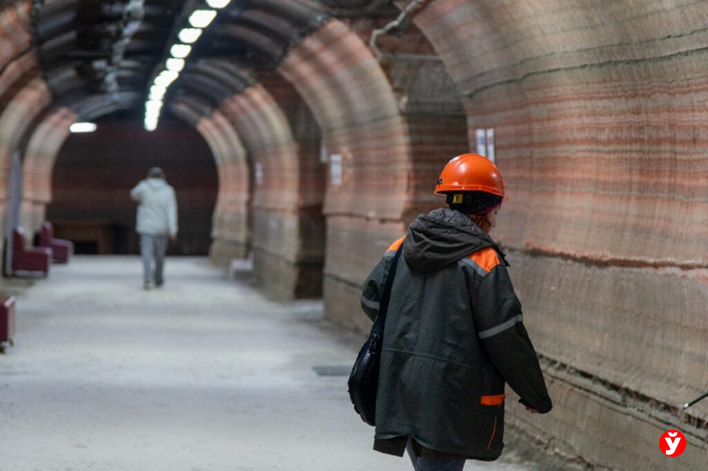 Нас встречает маркетолог Республиканской больницы спелеолечения Юлия Лагун, которая знает о подземном отделении буквально всё. Мы проходим по коридорам, где ещё нет пациентов — они спустятся чуть позже. Оказывается, в коридорах разная высота потолков: там, где ехал современный комбайн, выработка выше и просторнее. Но главное различие — в цвете соли на стенах.