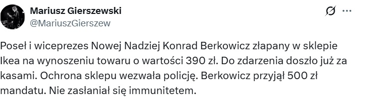 Инцидент произошёл в понедельник. О нём сообщил журналист Radio Zet Мариуш Гершевский в соцсети Х. После задержания депутата охрана вызвала полицию.