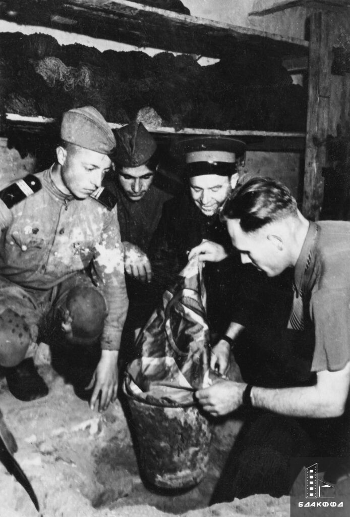 — Мы втроем были в одном из казематов: я, Фольварков и Тарасов. Я вырыл яму, заложил знамя в шелковый чехол и положил в брезентовое ведро, а потом сверху прикрыл цинковым… засыпал землей… замаскировал мелкой соломой.