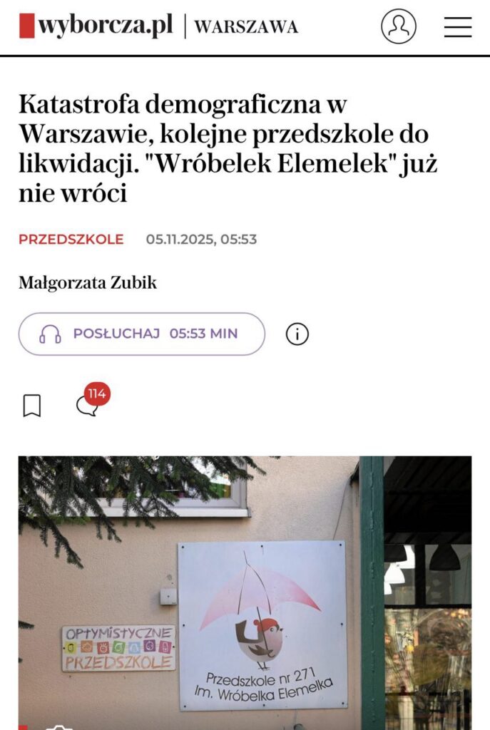 Почему это вопиющая новость? Дело в том, что столица притягивает население и капитал — туда едут работать молодые люди со всей страны и зарубежья, поэтому инфраструктуры всегда не хватает. А тут в самом перспективном городе Польши детсады оказались не нужны — дошкольные учреждения упраздняются в микрорайонах Беланы, Прага-Полудне и Сродместе. Причина в том, что в этом году в столице родилось 11 тысяч детей, тогда как в 2017 было 19, а по прогнозу на 2027 будет только 9.