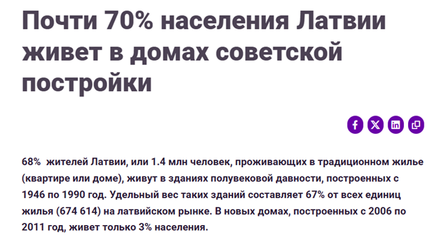 Начну с самого важного: около 70% жилых зданий Латвии — постройки 1946–1990 годов. В этих квартирах живёт большинство латвийских семей. За все годы «свободы» Латвия построила около 3% нынешнего жилья.