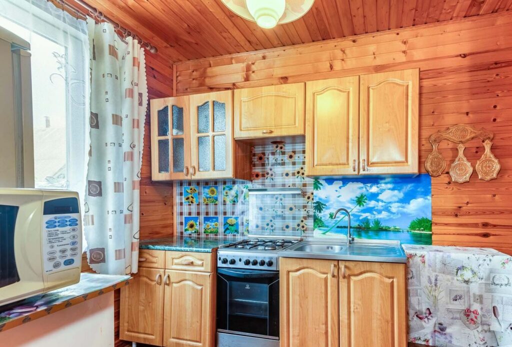 Кухня полностью обустроена: здесь есть качественная деревянная мебель, плита, оригинальный фартук с декором, а также обилие света. На мансардном этаже, в который ведет деревянная лестница, располагается одно большое пространство, где организована еще одна спальня.