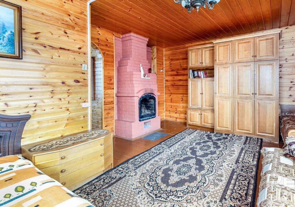 Отопление в доме осуществляется печным способом, а также с помощью камина. Водоснабжение обеспечивается водопроводом, а также имеется газовая плита, работающая от газового баллона. Важно отметить, что в доме предусмотрена возможность обустройства санузла — вода уже подведена, а вывод канализации идет в септик. Пока что туалет расположен в отдельном блоке на улице.