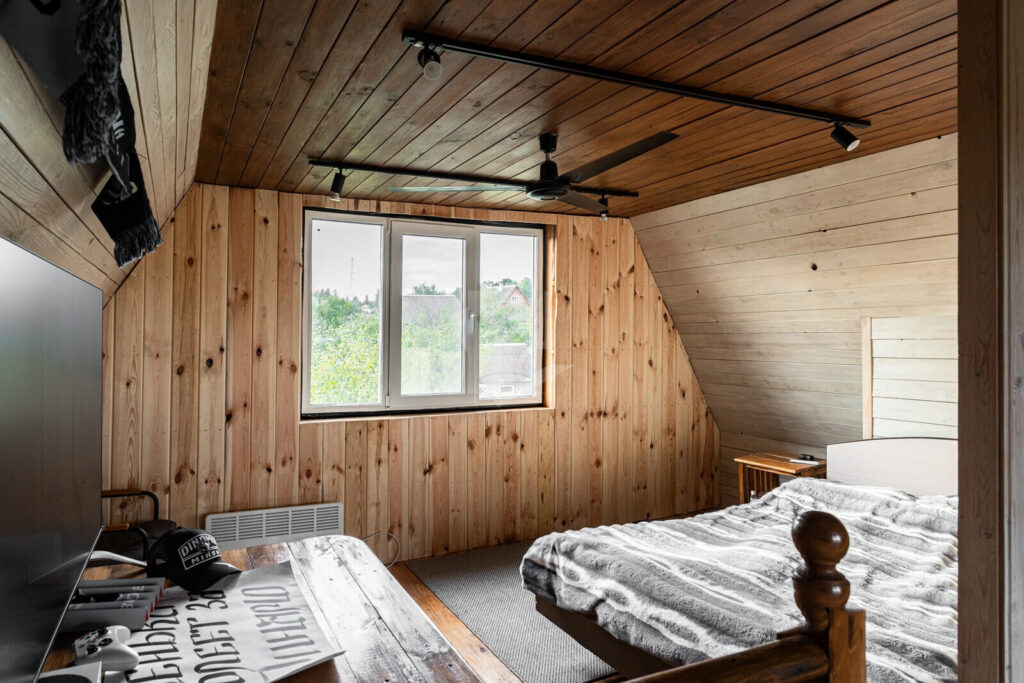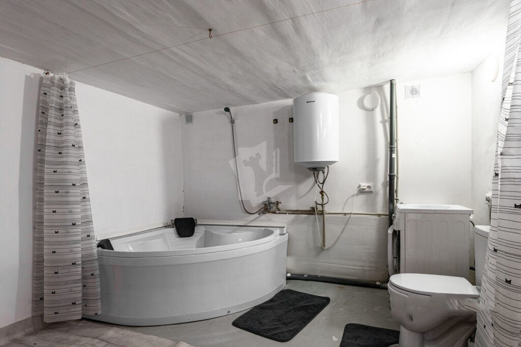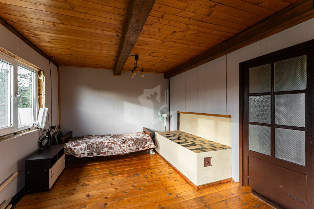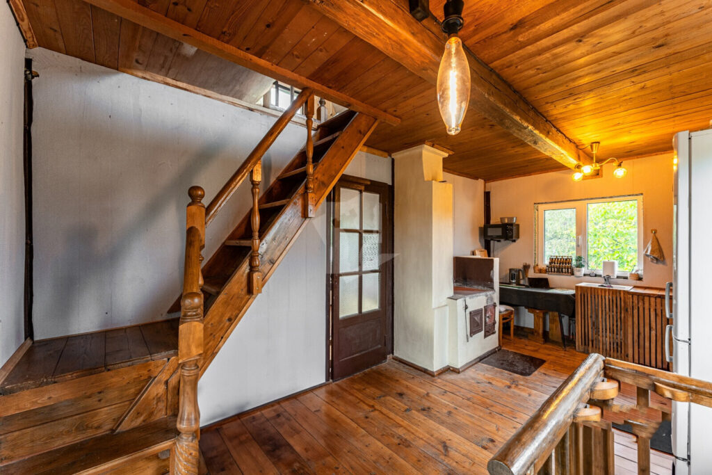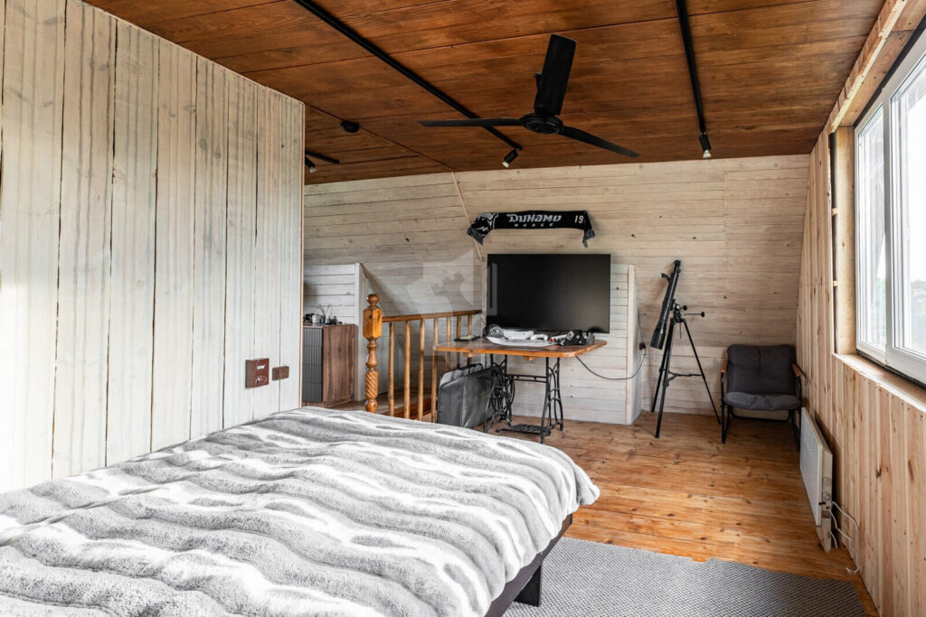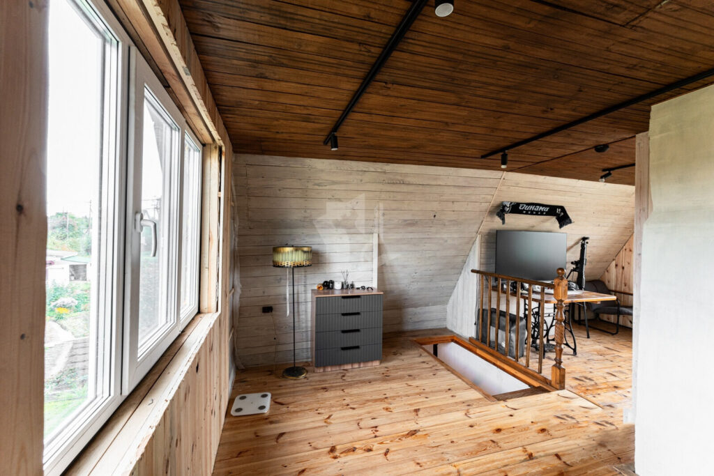 На второй этаж ведет удобная лестница, выполненная из натурального дерева. На верхнем уровне также обустроены небольшие комнаты. В доме имеется совмещенный санузел с ванной. Вода подведена, установлена местная канализация, а также бойлер для горячего водоснабжения. Кроме того, в доме есть небольшой погреб.