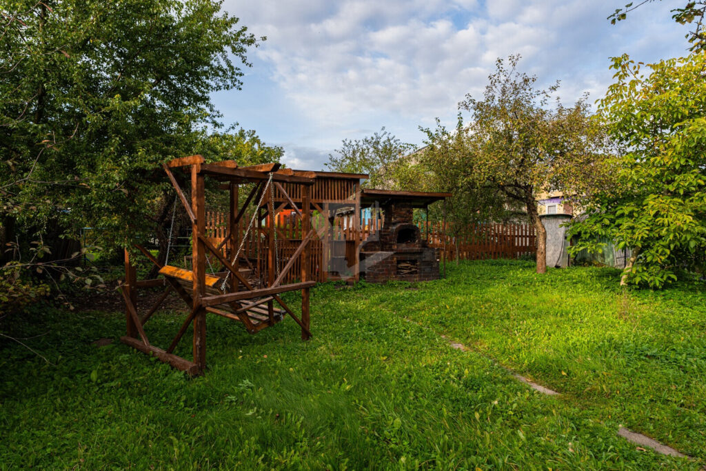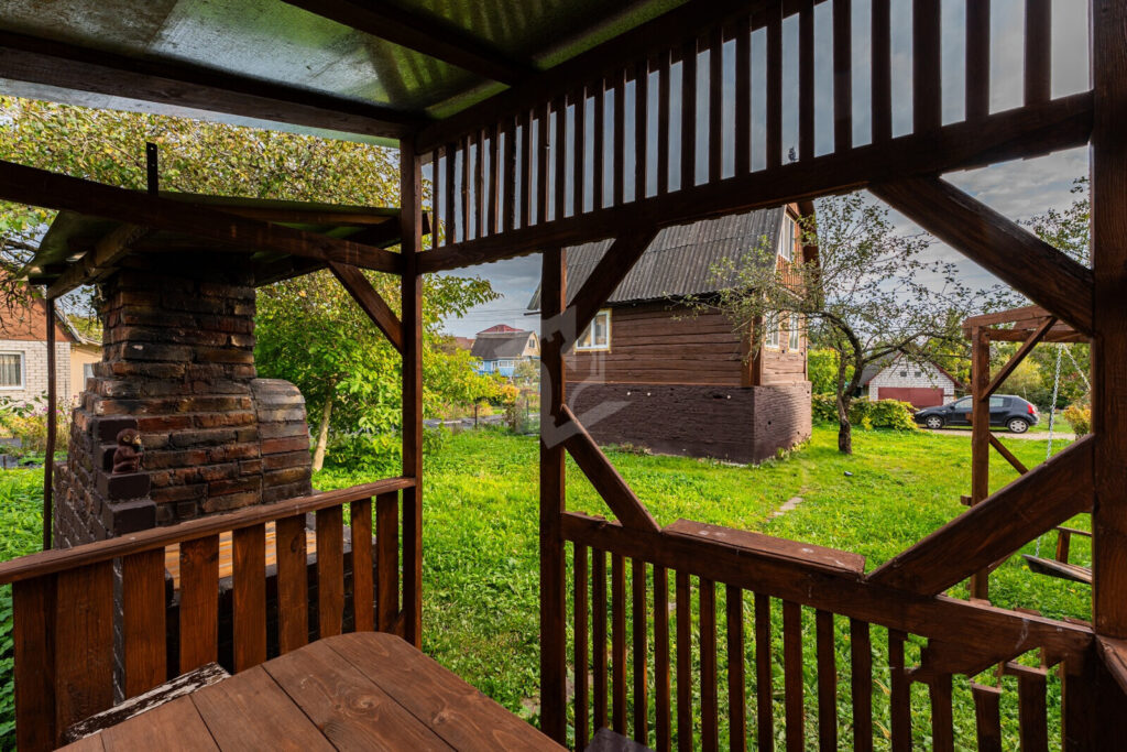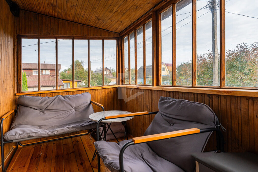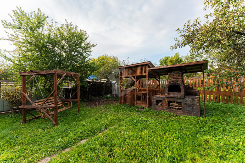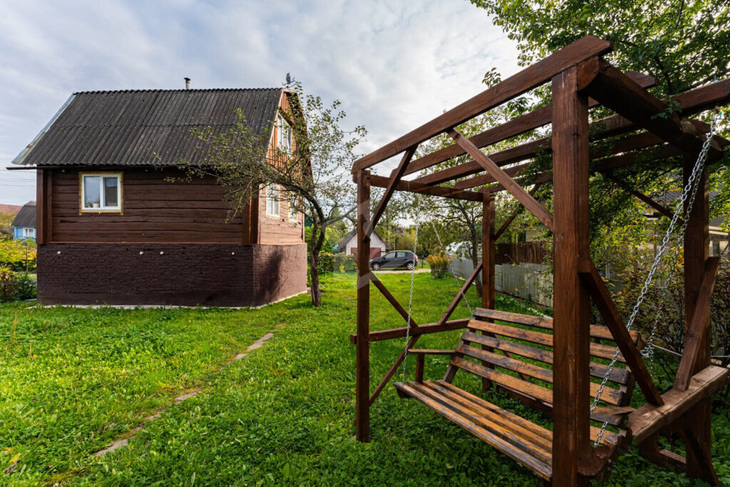 Особое внимание стоит уделить застекленной веранде, которая служит атмосферным местом для отдыха и общения с природой. На приусадебном участке площадью 5 соток также построены беседка, теплица и мангальная зона. Здесь также установлены качели.