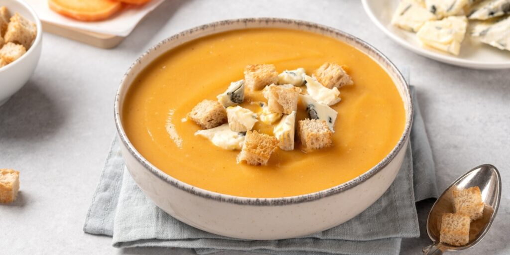 - Верните суп-пюре в кастрюлю, прогрейте, приправьте солью и перцем. Подавайте горячим, дополнив хрустящими сухариками и крошкой голубого сыра.