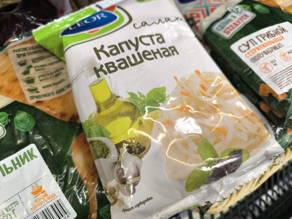 Но объём ёмкости разный, значит смотрим цену за килограмм. «Капусту по-белорусски» предлагают по 9 рублей 18 копеек, квашеную с забавными надписями «Капуста з морквай — найлепшыя сяброўкі» и «Бабуля адобрыць!» — 5 рублей 99 копеек.