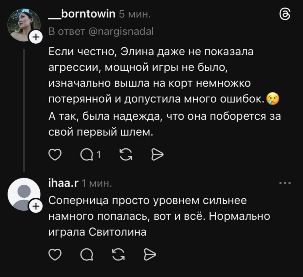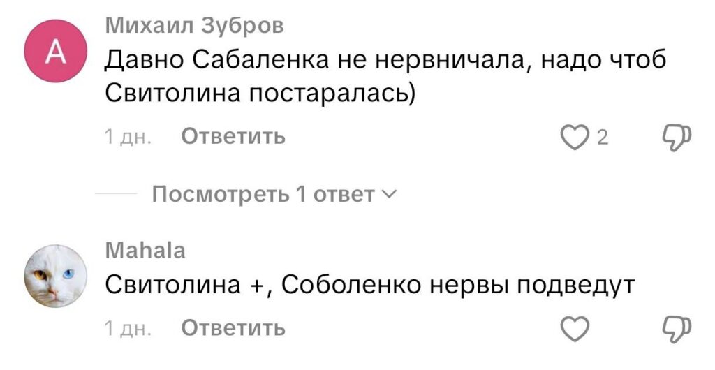 Не стоит забывать и выпады Марты Костюк. В финале Брисбена она не упомянула Соболенко в речи после встречи. Начала плакать и говорить, как ее родственникам холодно и плохо, но по итогу отхватила от европейской публики и осталась виновной в сказанном.