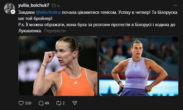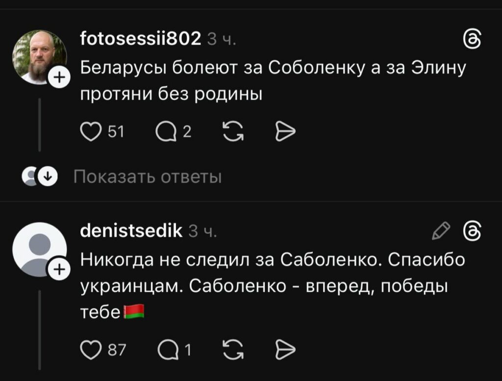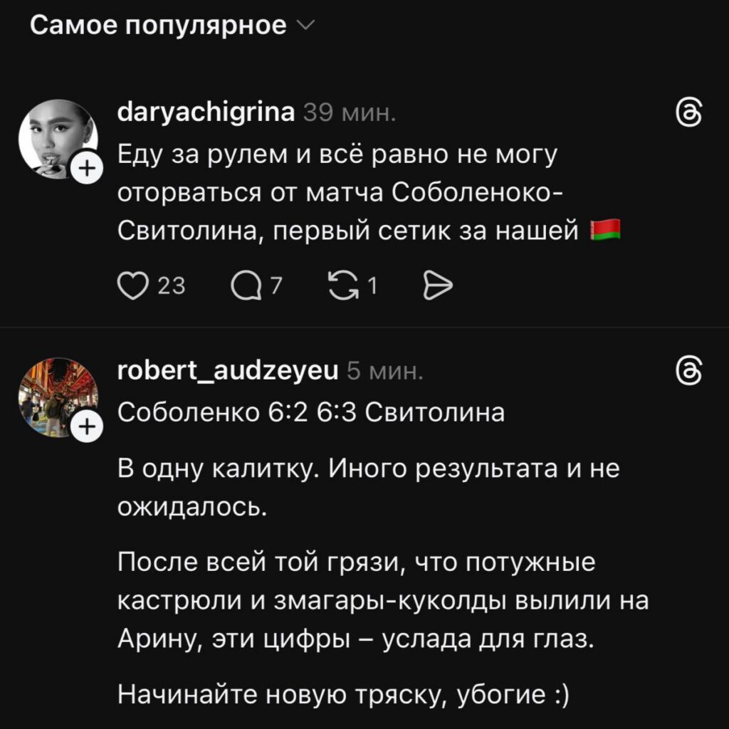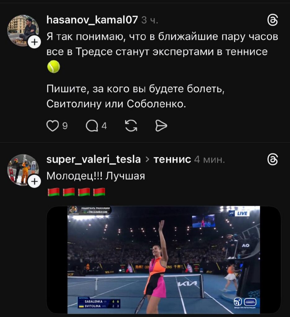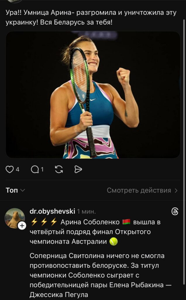 В любом случае адекватных комментариев больше. Белорусы поддержали свою спортсменку и пожелали ей взять третий титул в Австралии. Надеемся, что Арина до развязки не нарвется на неадекватных украинцев и их писанину. Мы не против, если кто-то болел за Элину, главное, не разводить грязь и не переходить на личности. Проигрывать тоже нужно уметь. Мы ничего не имеем против украинского народа и их спортсменов. Но когда те хамят, жалуются и обвиняют в чем-то наших. Извините, молчать не получиться.