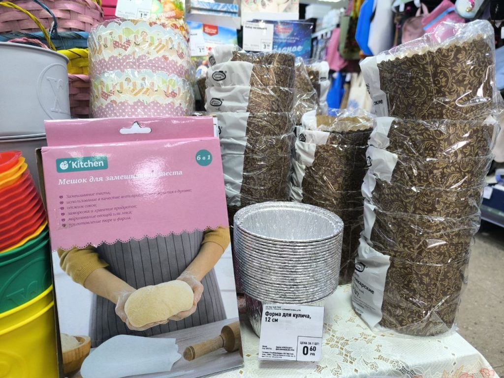 Выбор товаров действительно большой. Различные формы для куличей и пасхальной выпечки — от 60 копеек до 4 рублей, мешок для замешивания теста стоимостью 2 рубля, пасхальные веточки — от 3 рублей и подсвечники пасхальные — от 4,50 до 7 рублей.