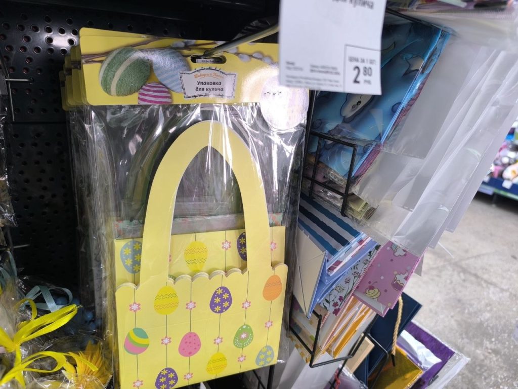 Корзины для пасхальных подарков — от 4 рублей, коробочка подарочная «Яйцо» — 2 рубля 80 копеек, упаковки для кулича и яркие наклейки — от 1 рубля.