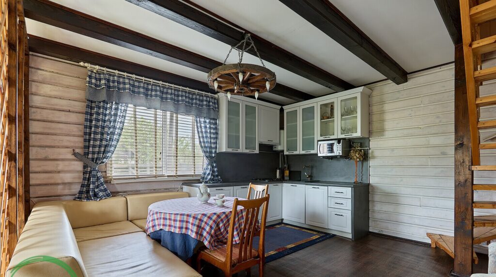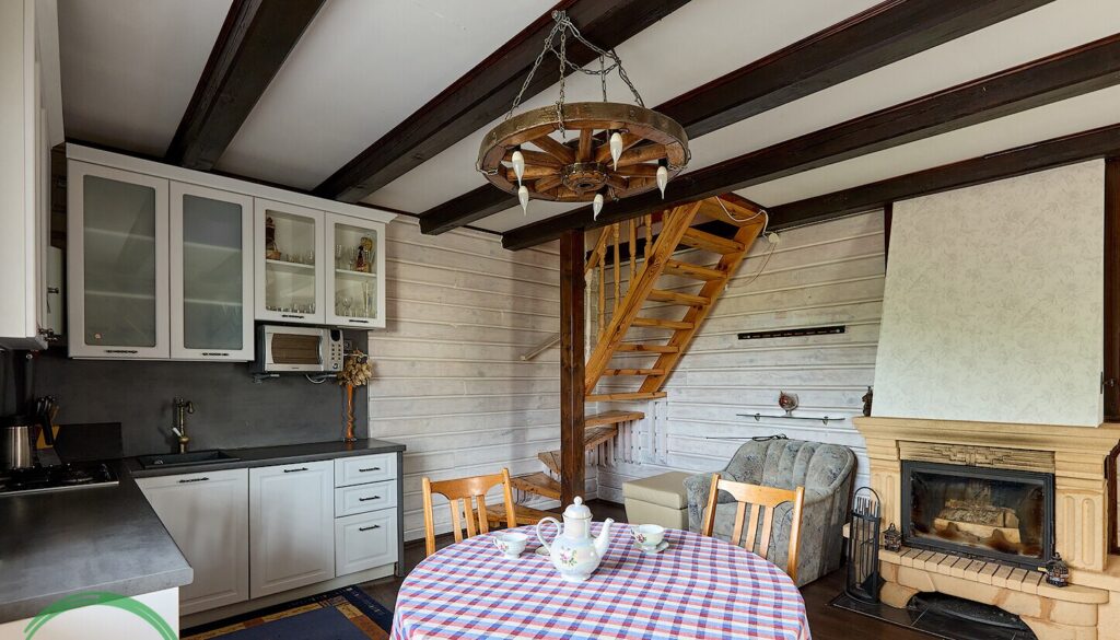 Первый этаж дома включает в себя просторную гостиную, где установлен камин, создающий уютную атмосферу, и большую кухню, оборудованную всей необходимой техникой, включая посудомоечную машину и бойлер. Это идеальное место для семейных встреч и дружеских посиделок.