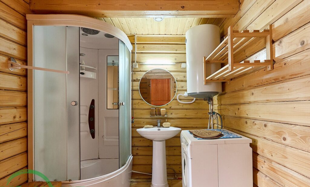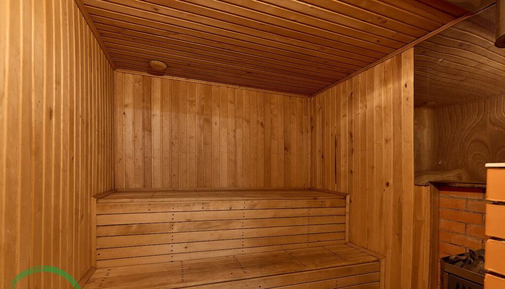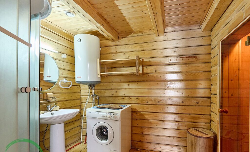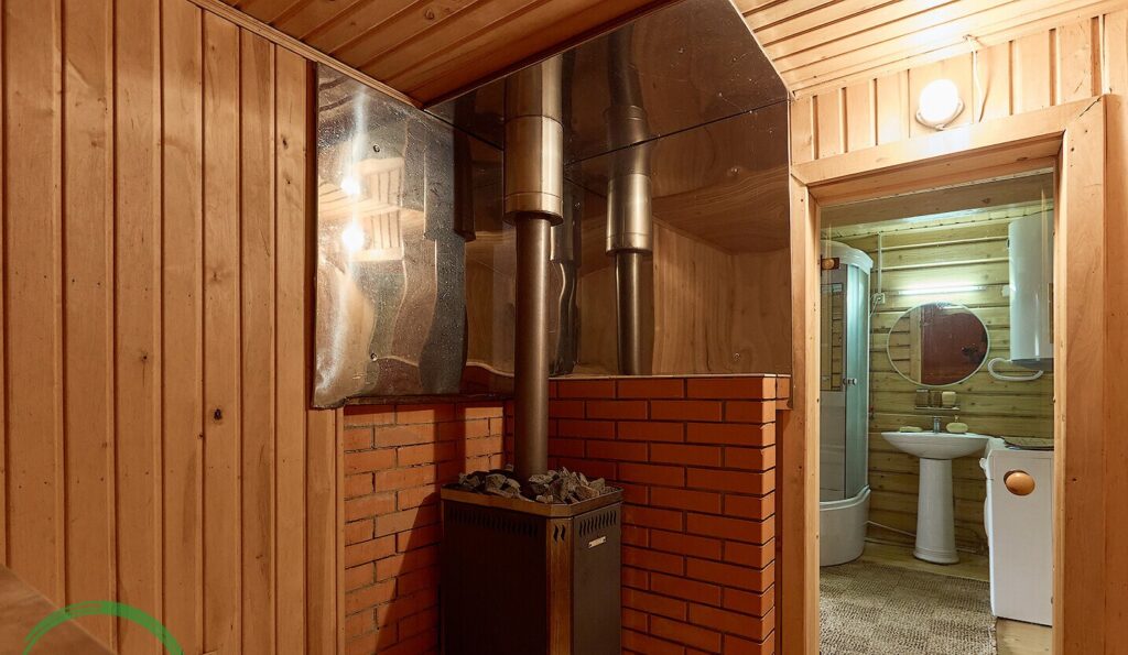 На участке, площадью 15,6 соток, расположена баня, выполненная также из бруса, площадью 29 квадратных метров. Внутри бани имеется парилка, а также душевая и стиральная машина. К тому же, здесь установлен бойлер для обеспечения горячей воды. Рядом с баней находится каркасный бассейн.