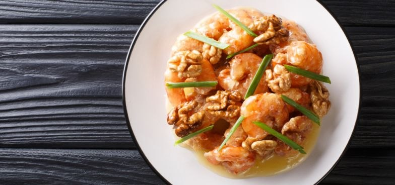 - Не мешкая, пока кляр горячий, смешайте обжаренные морепродукты с медово-майонезным соусом. Сверху рассыпьте орехи.