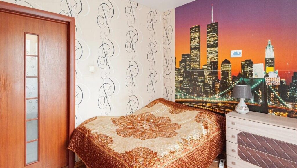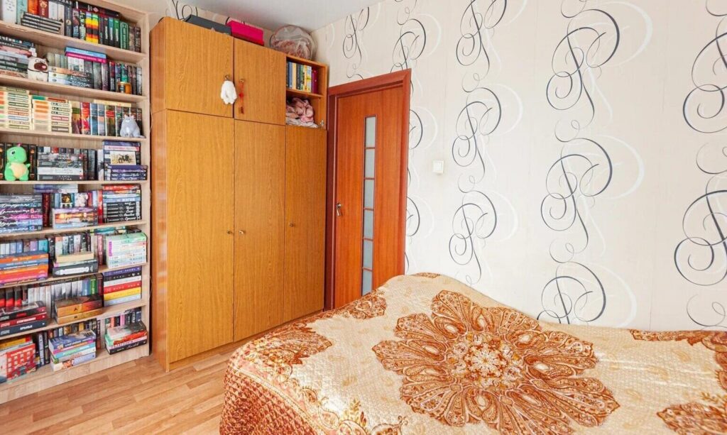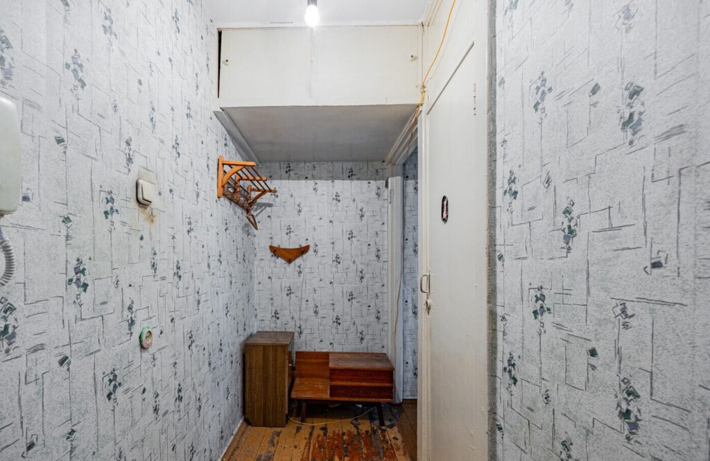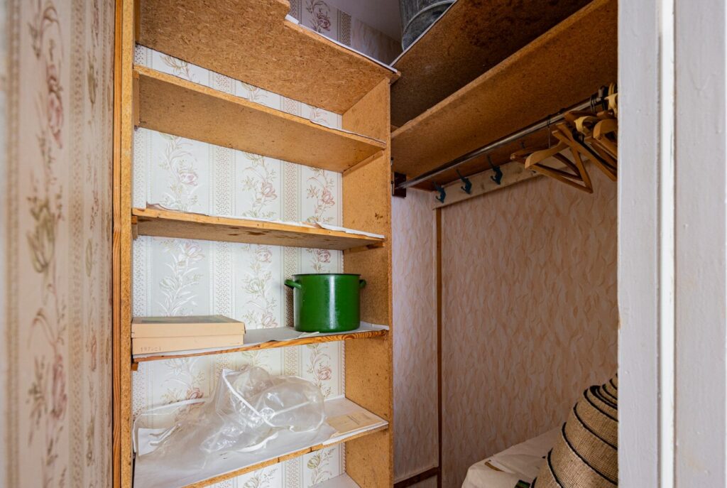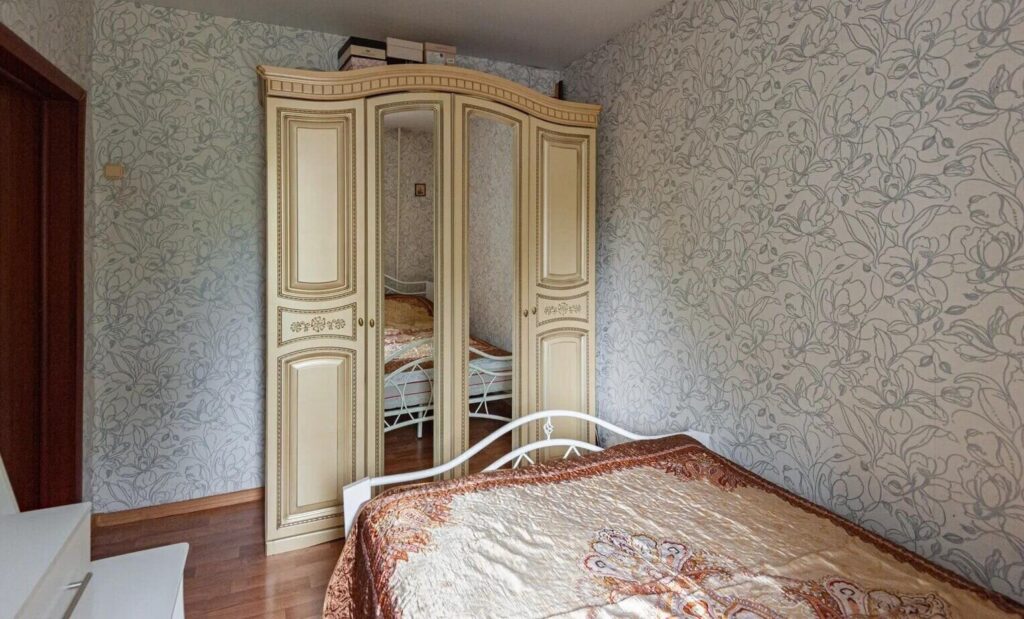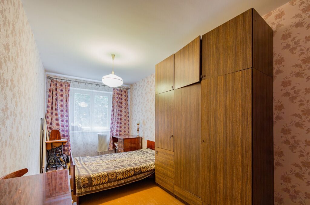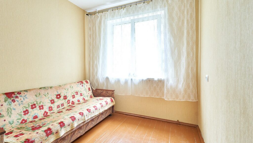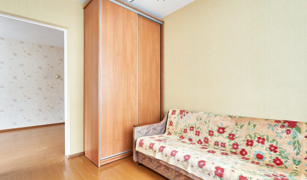 Комнаты требуют обновления и ремонта. В окнах установлены стеклопакеты, а на полу уложены деревянные доски. Одна из комнат является проходной, что стоит учитывать. В изолированной спальне имеется кладовая, которую можно преобразовать в гардеробную. В квартире частично остается мебель. Санитарный узел совмещенный, что также может быть удобным для проживания.