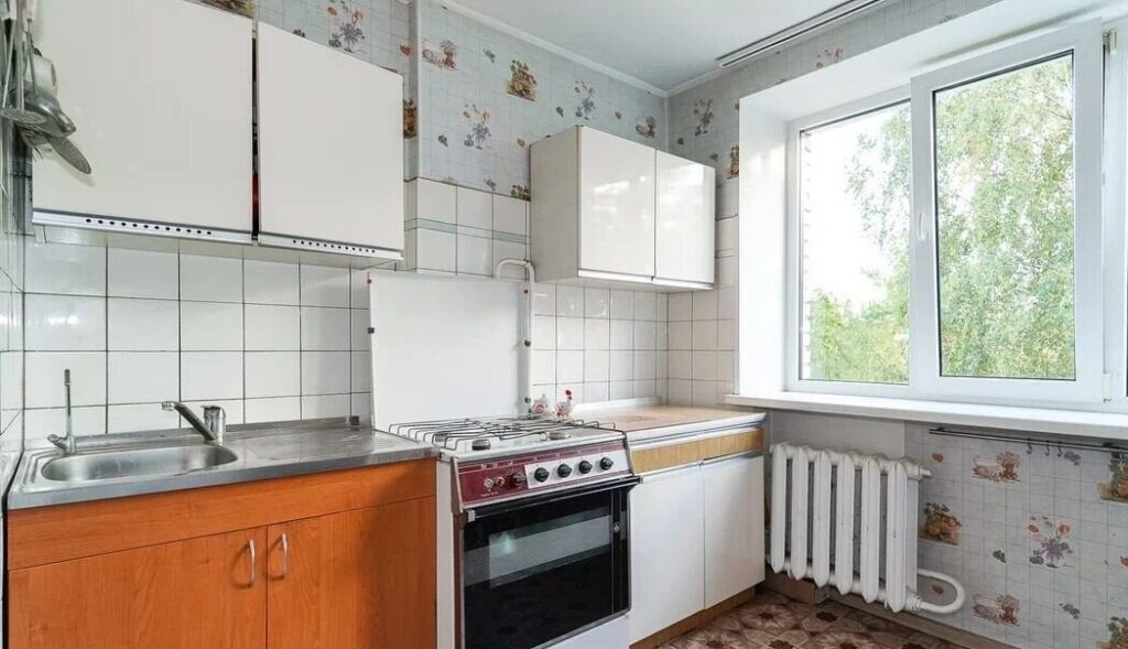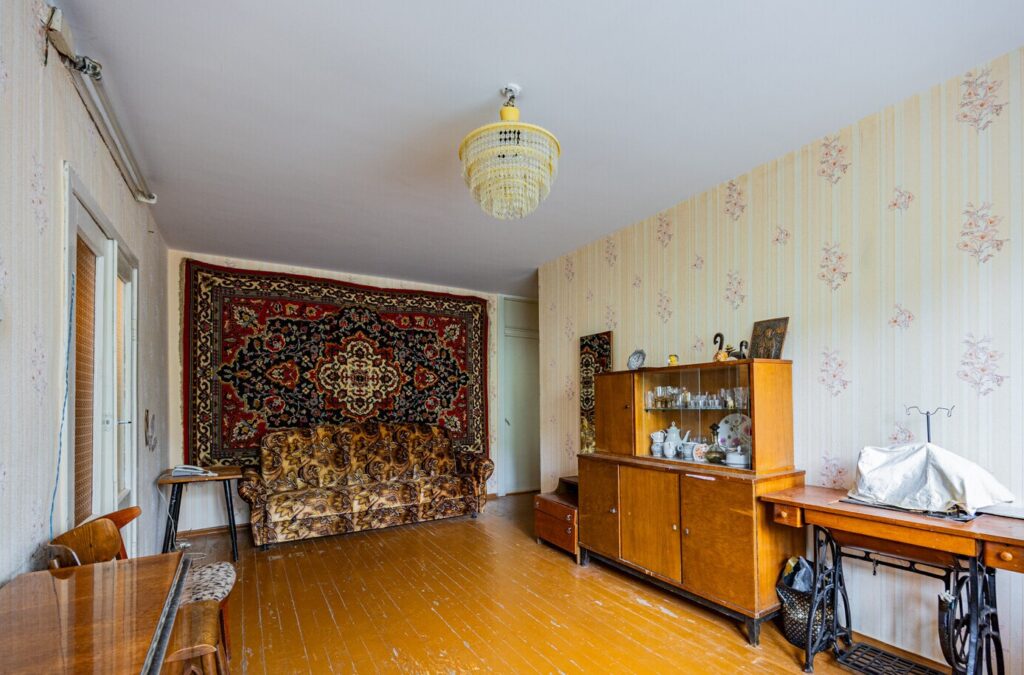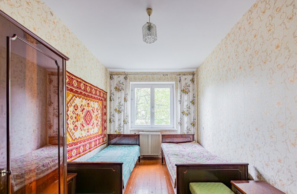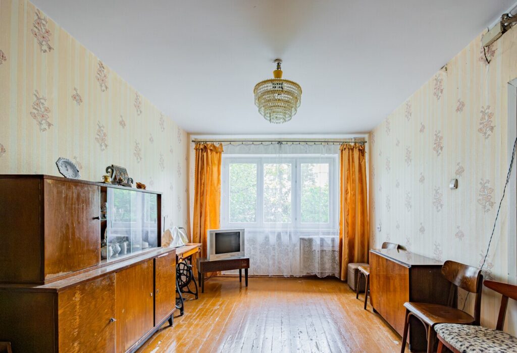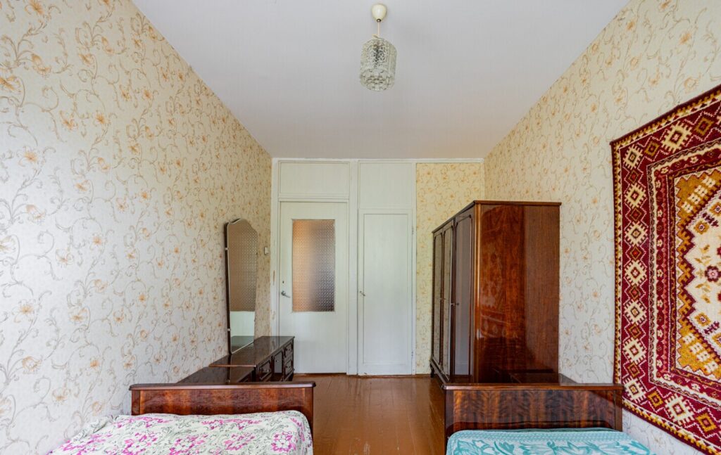 Эта квартира расположена в трехэтажном сталинском доме, построенном в 1950 году, по адресу Строителей, 2. Трехкомнатная квартира находится на втором этаже и имеет площадь 52 квадратных метра. Кухня занимает 4,8 метра.