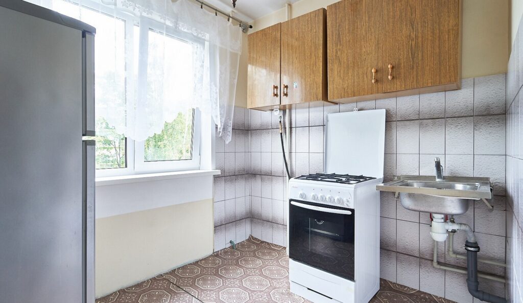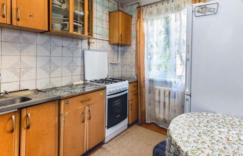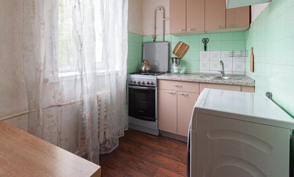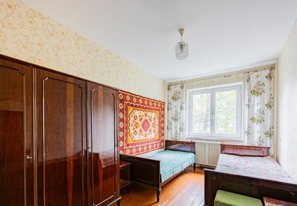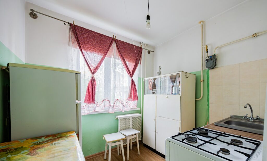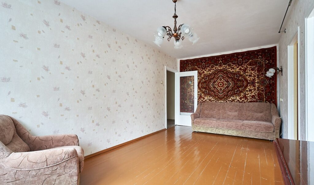 Эта квартира расположена в трехэтажном сталинском доме, построенном в 1950 году, по адресу Строителей, 2. Трехкомнатная квартира находится на втором этаже и имеет площадь 52 квадратных метра. Кухня занимает 4,8 метра.