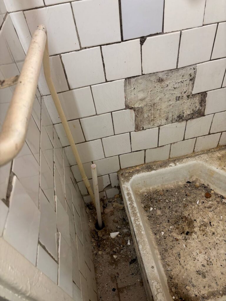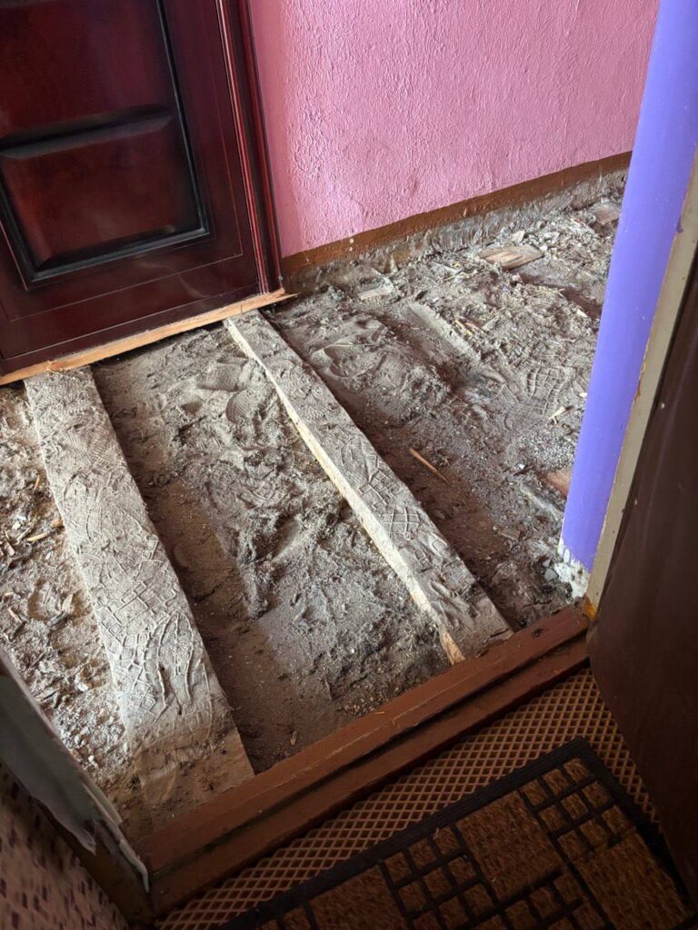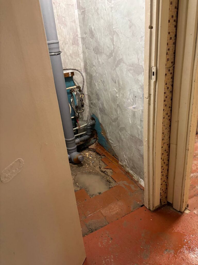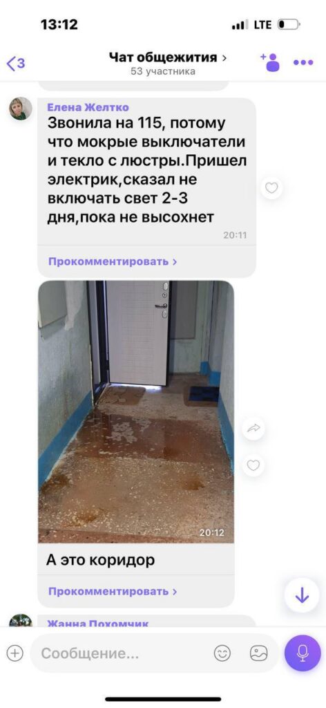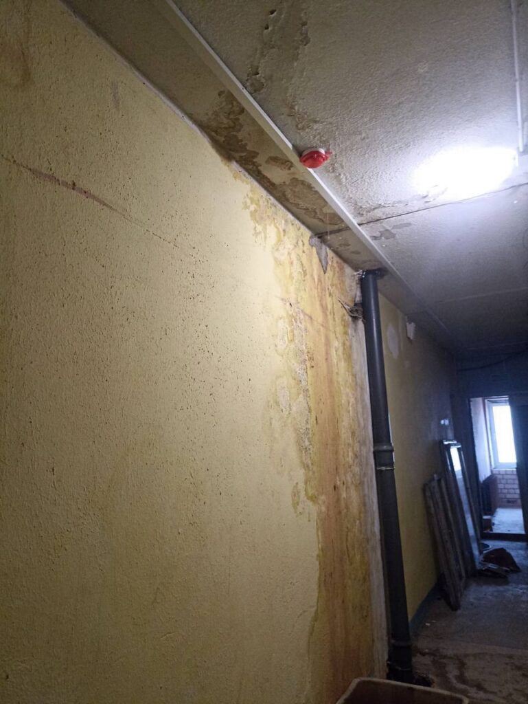 — Строители работали на крыше, а потом уехали. Всё остановилось, а дожди шли, и с крыши текло, много чего затопило. При замене стояков выломали все в туалете, сняли унитаз, положили новые трубы. Когда у нас работали сантехники на день снимали унитаз и некуда было ходить в туалет. Когда я была у соседки сверху, там сидела с детьми, а у нас работали сантехники, какую-то трубу не так сделали, и вся вода фонтаном потекла вниз, — рассказала жительница общежития Анастасия.