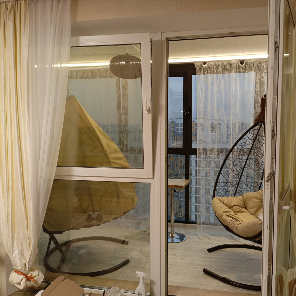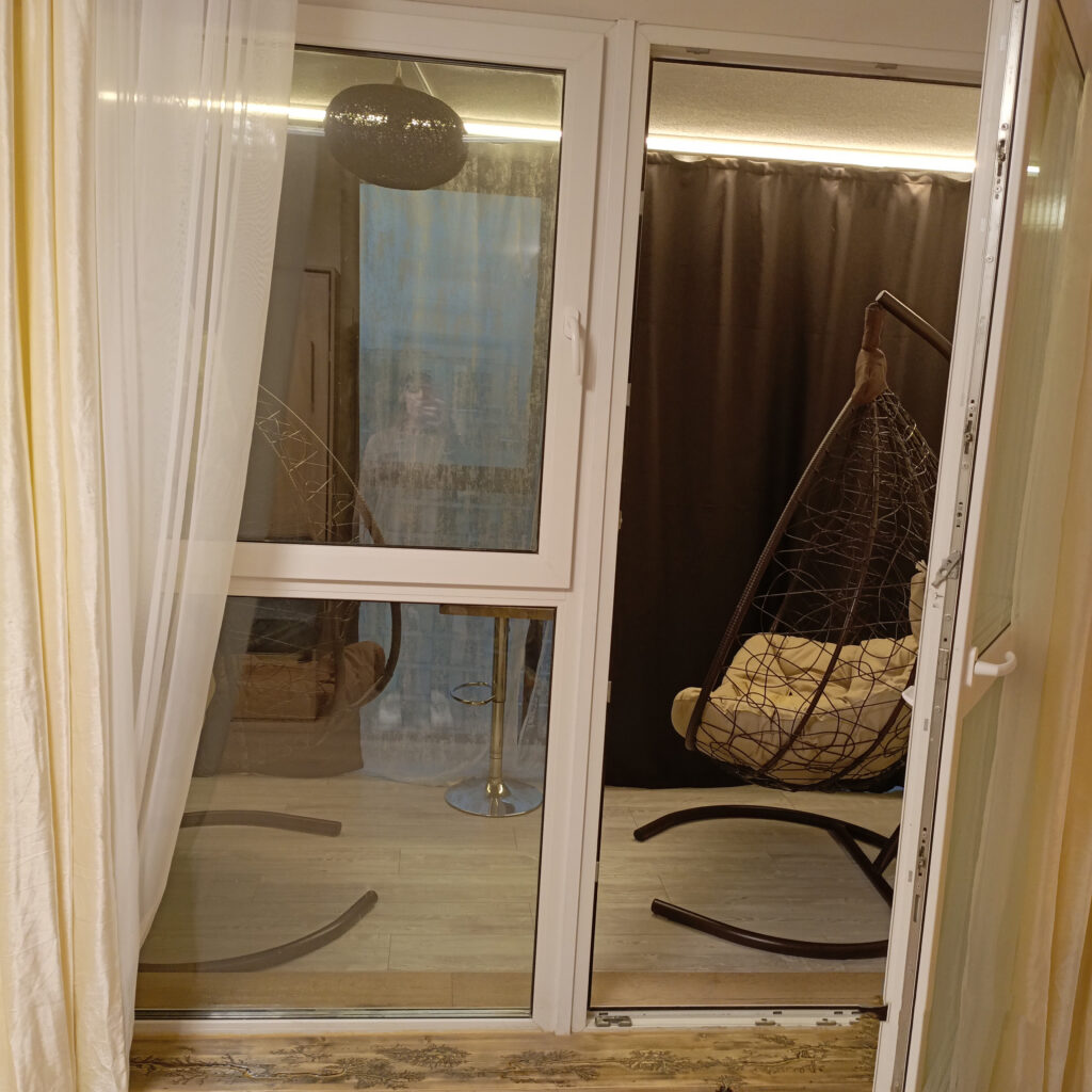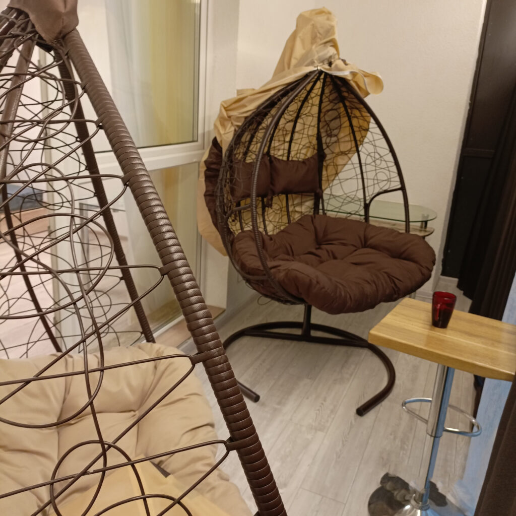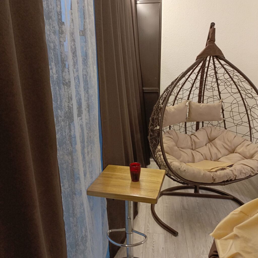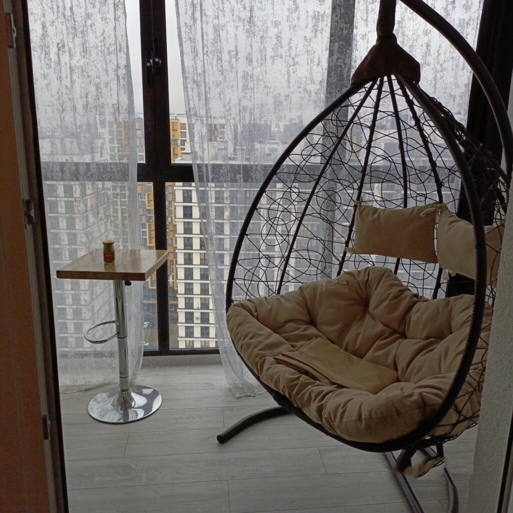 Главной “фишкой” этой квартиры является утепленная лоджия, организованная под зону отдыха. Здесь имеется два подвесных кресла и кофейный столик. Из окна открывается панорманый вид на город.