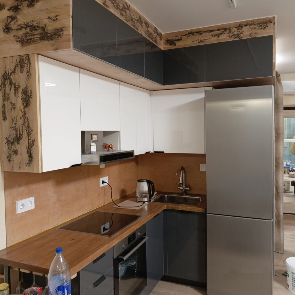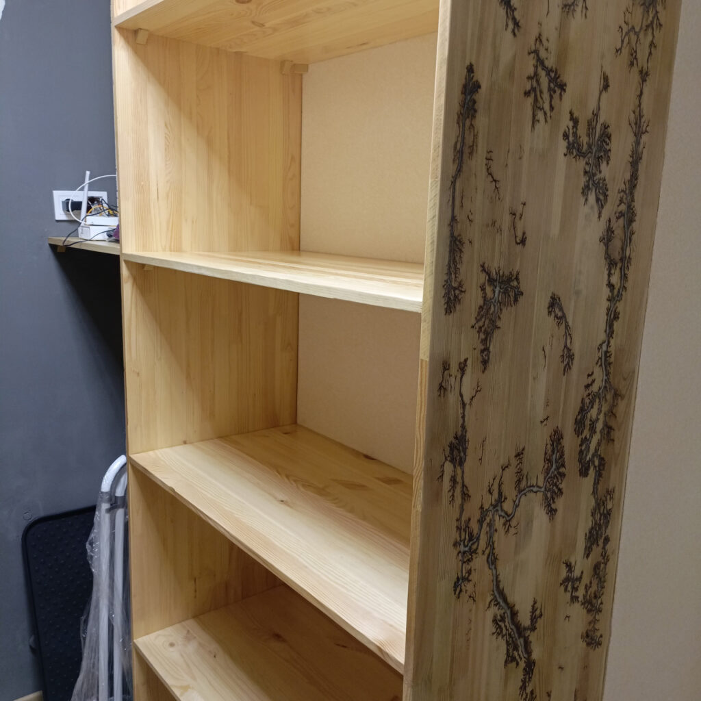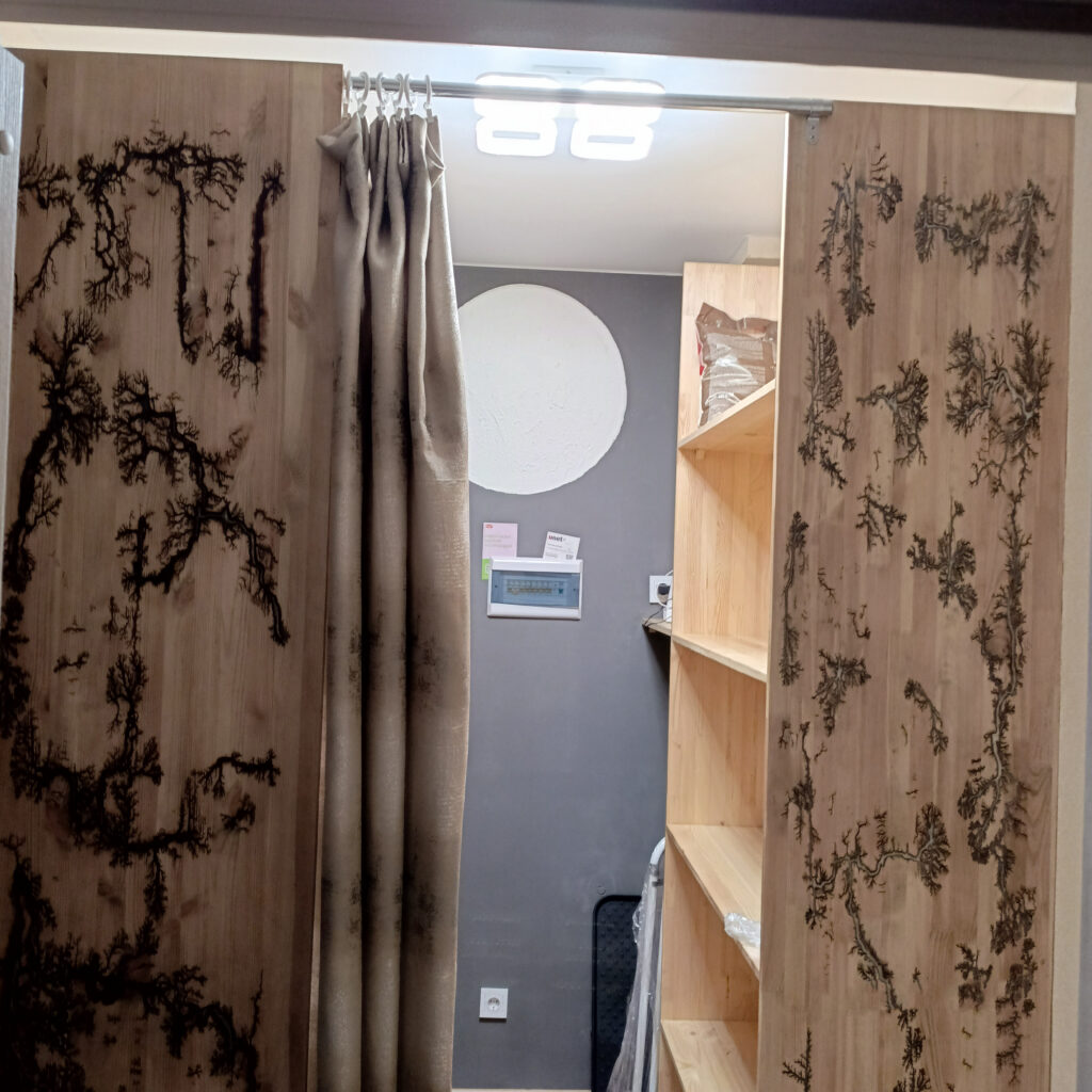 Необычным интерьерным вариантом также служит деревянный шкаф для одежды с выжженым рисунком. Интересно, что входная дверь тоже с изюминкой — с внутренней стороны расположено большое зеркало.