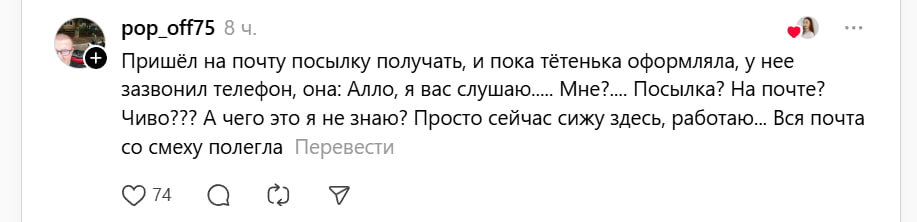 Но главный хит — история про работницу почты, которой во время работы позвонили «с почты» насчет посылки. «Я вас слушаю… Мне?.. Посылка? На почте? Чиво??? А чего это я не знаю? Просто сейчас сижу здесь, работаю…» — цитируют в сети этот шедевральный диалог.