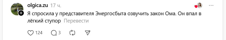 Другая героиня решила проверить «представителя Энергосбыта», попросив озвучить закон Ома. «Он впал в легкий ступор», — делится она результатами эксперимента.