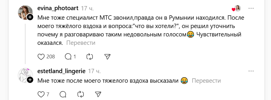Звонок от «специалиста МТС» с литовского номера закончился неожиданным советом: девушке предложили «закрыть свой рот и слушать его». Когда эта история появилась в Threads, пользователи пользователи сети устроили настоящий мастер-класс по троллингу телефонных аферистов.