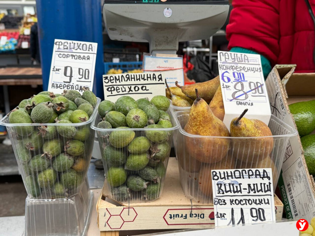Особой популярностью на торговых рядах пользуется фейхоа по 9,90 руб./кг. Эта зеленая экзотическая ягода родом из Южной Америки, а свое название получила в честь бразильского первооткрывателя Жуана да Силва Фейжо. Ее любят за необычный вкус, напоминающий смесь киви, ананаса и клубники, и высокое содержание йода.