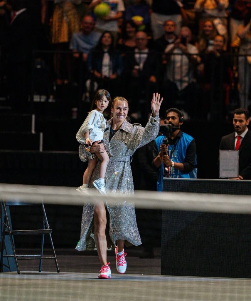Уже с первых минут стало ясно: это не просто матч, а настоящее шоу. Арина Соболенко появилась эффектно — в блестящем, эпатажном плаще, спускаясь по лестнице вниз под музыку и пританцовывая. Публика встретила ее бурными аплодисментами, а сама Арина, улыбаясь, сразу задала настроение всему вечеру.