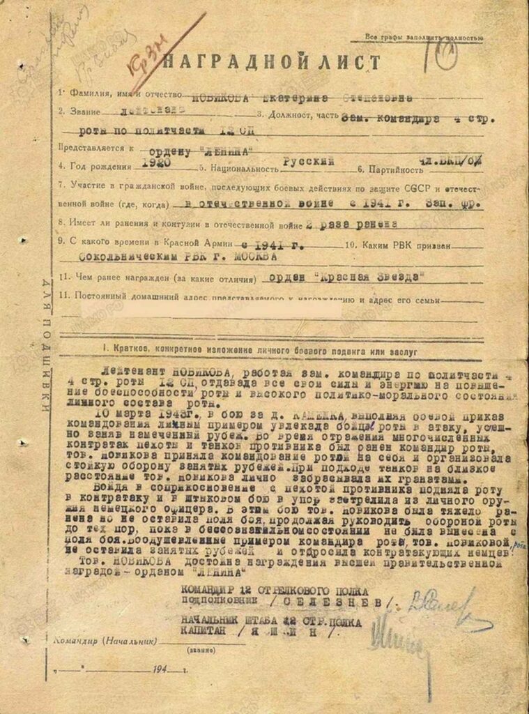 Обращаю внимание читателей, что наградной лист на Катю Новикову составлен и подписан не командиром стрелкового батальона и даже не командиром полка, а командиром стрелковой дивизии генерал-майором Коваленко и комиссаром дивизии бригадным комиссаром (воинское звание политработника Красной Армии в тот период, прим. автора) Кабичкиным, и награждена была Екатерина Новикова не медалью, а орденом Красной Звезды!