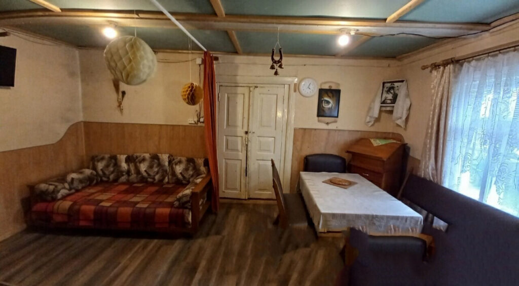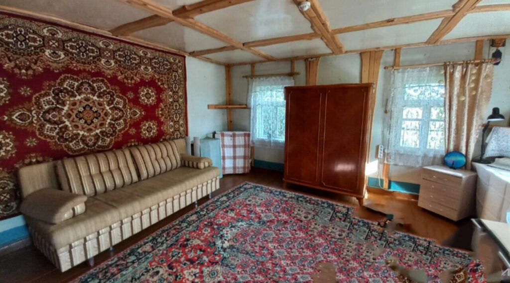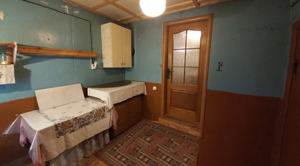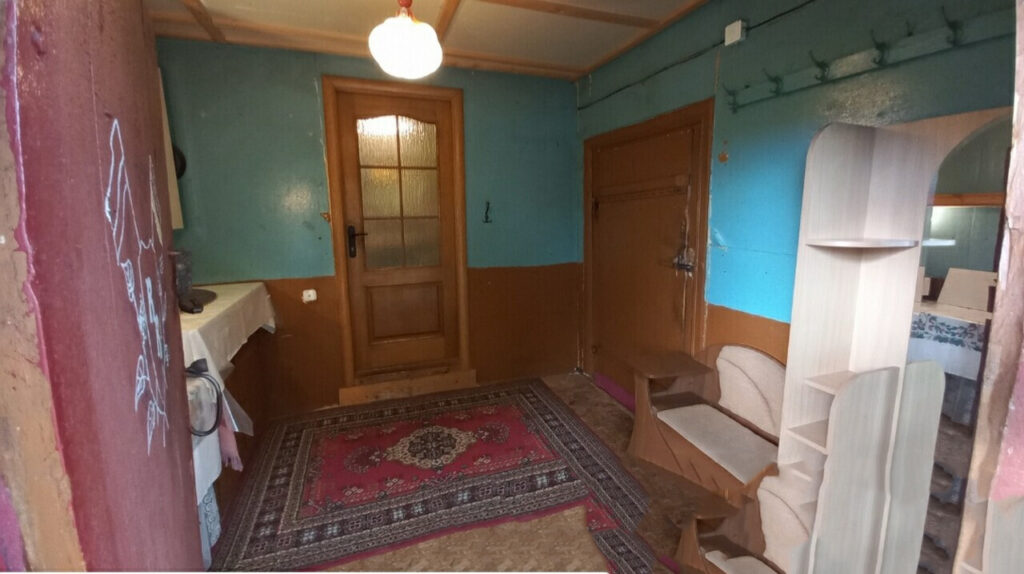 Дом находится в деревне Гнесичи и представляет собой надежное деревянное строение, покрытое металлической крышей. Его общая площадь составляет 46,2 квадратных метра. Внутренняя планировка включает в себя просторную кухню с рабочей печью. Также в доме предусмотрен коридор и, что особенно важно, собственный санузел.
