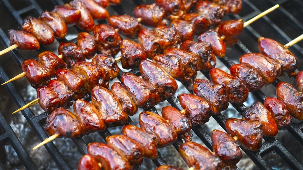 Соединить все ингредиенты в миске (чеснок предварительно измельчить), оставить мариноваться на 10–12 часов. Угли должны хорошо прогореть, чтобы жар не был слишком интенсивным. Аккуратно нанизываем сердечки на шампур и отправляем на мангал. Жарим, постоянно переворачивая, пока не появится румяная корочка. Готовность можно проверить, надрезав сердечки ножом.