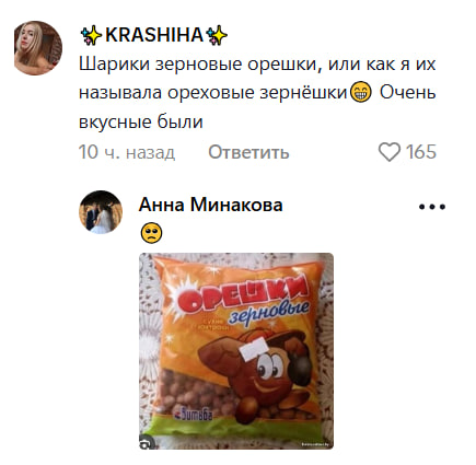 И снова — эффект незамедлительный. В комментариях ее тут же поддержали: «Шарики зерновые орешки, или как я их называла «ореховые зернёшки» Очень вкусные были», — с ностальгией уточнила девушка. «Шарики топ!» — лаконично и емко подвел итог другой пользователь.