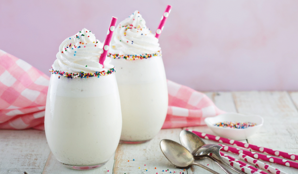 - Для праздничного вида можно декорировать бокалы: смочите их края молоком и окуните в кондитерскую посыпку, а затем ею же слегка посыпьте сливочную шапку.