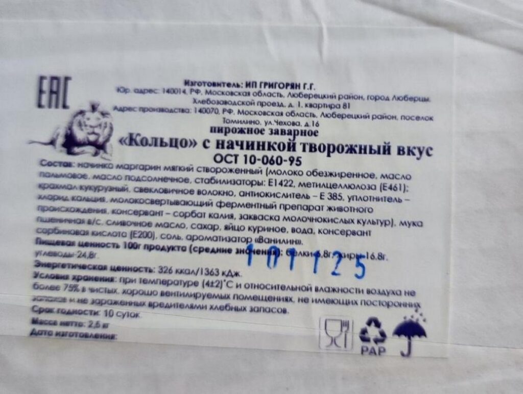 Под запрет также попало заварное пирожное «Кольцо» с начинкой «творожный вкус». Проверка показала, что в составе указан компонент с некорректным наименованием — «маргарин мягкий створоженный». Такой вид масложировой продукции не предусмотрен действующими техническими регламентами. Кроме того, в составе обнаружен антиокислитель Е385, использование которого запрещено при производстве маргарина и мучных кондитерских изделий.