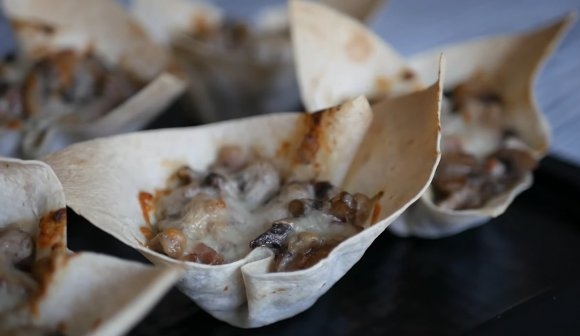 - Соберите и запеките. Разложите грибную массу по лавашным корзиночкам. Сверху можно посыпать оставшимся сыром. Отправьте в духовку на 12-15 минут, пока лаваш не станет хрустящим и золотистым, а сыр — аппетитно румяным.