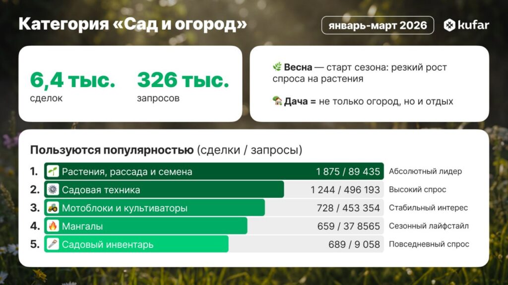 Абсолютным лидером сезона стала подкатегория «Растения, рассада и семена». С января по середину марта здесь зафиксировано 1875 сделок, а количество запросов приблизилось к 89,5 тыс. При этом пик спроса пришелся именно на март: если в январе было 316 сделок, а в феврале — 456, то только за половину марта — уже 1103. Помимо привычных культур, пользователи все чаще выбирают редкие и экзотические растения — пепино (дынную грушу), азимину («банановое дерево») и гибриды вроде ежемалины.