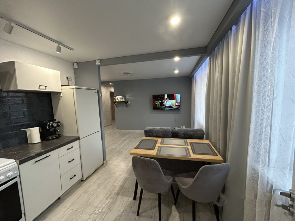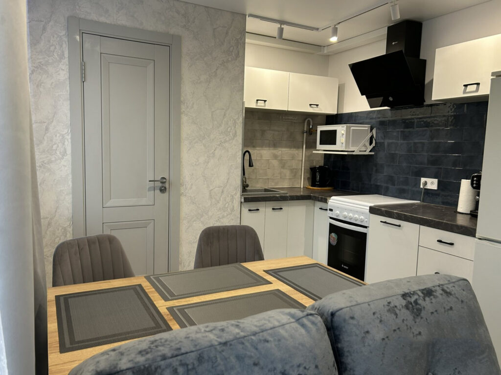 Кухня и гостиная соединены без двери. В проеме между кухней и гостиной можно увидеть ту самую дверь, которая ведет в ванную комнату.