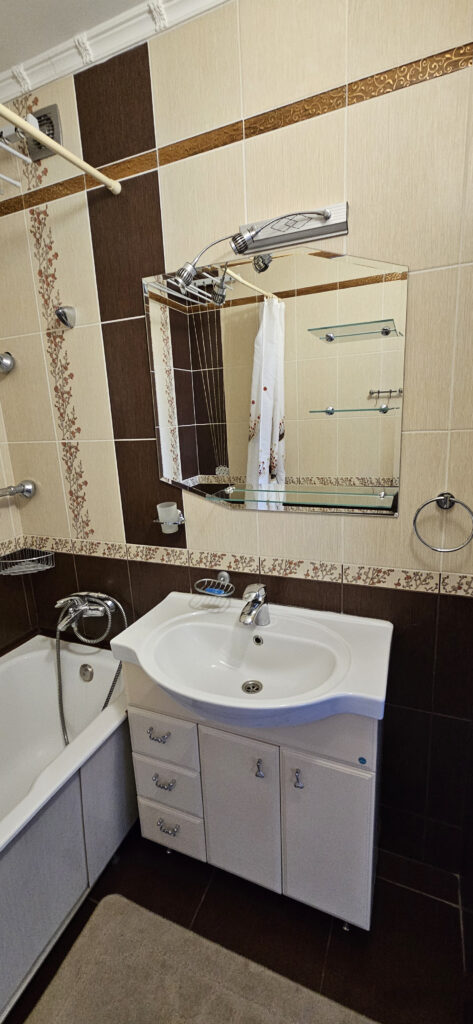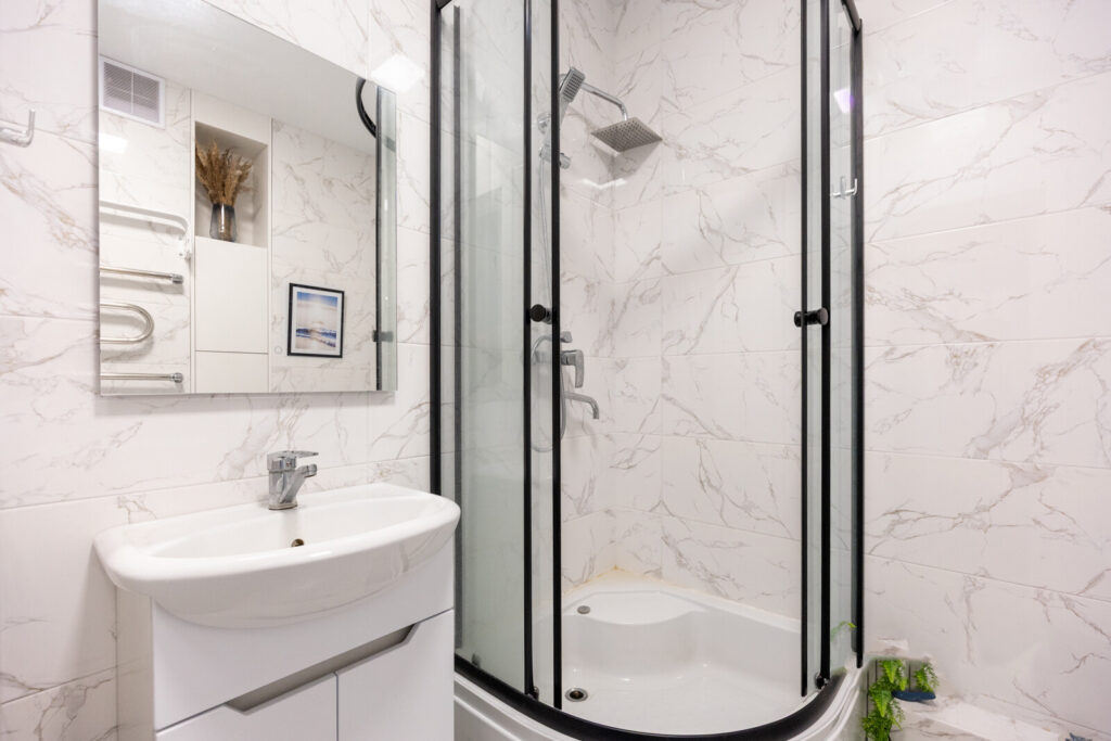 Ванная комната также полностью оборудована всем необходимым. Здесь установлена душевая кабина.