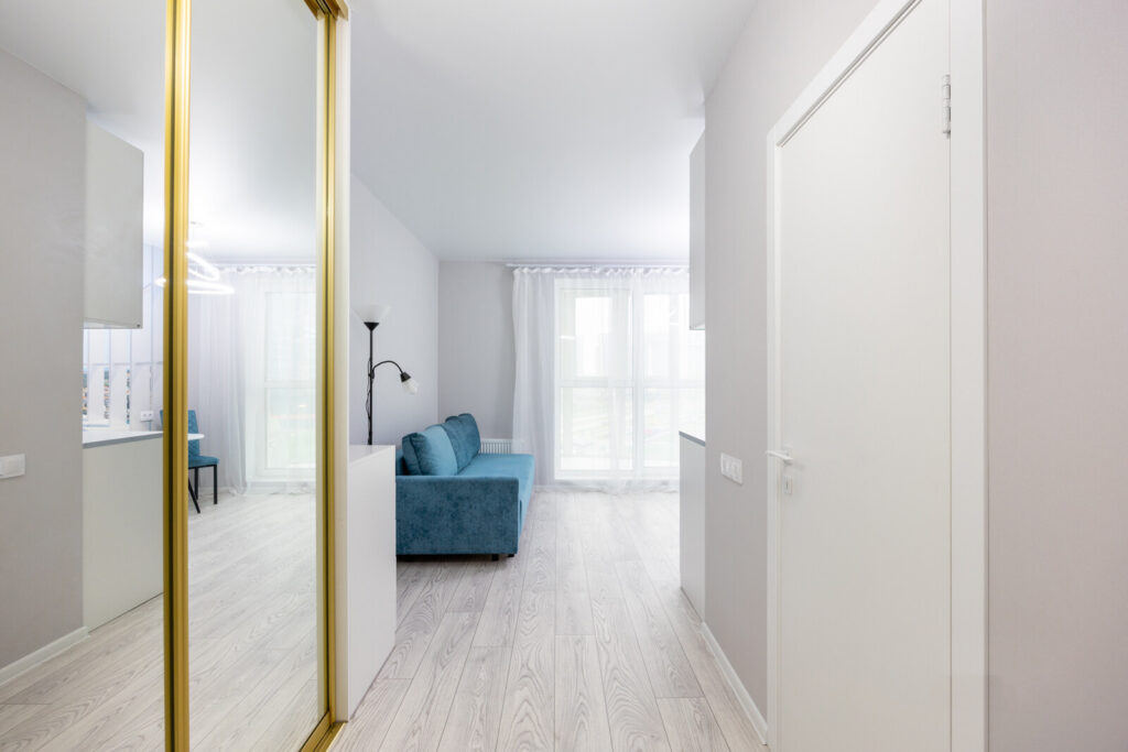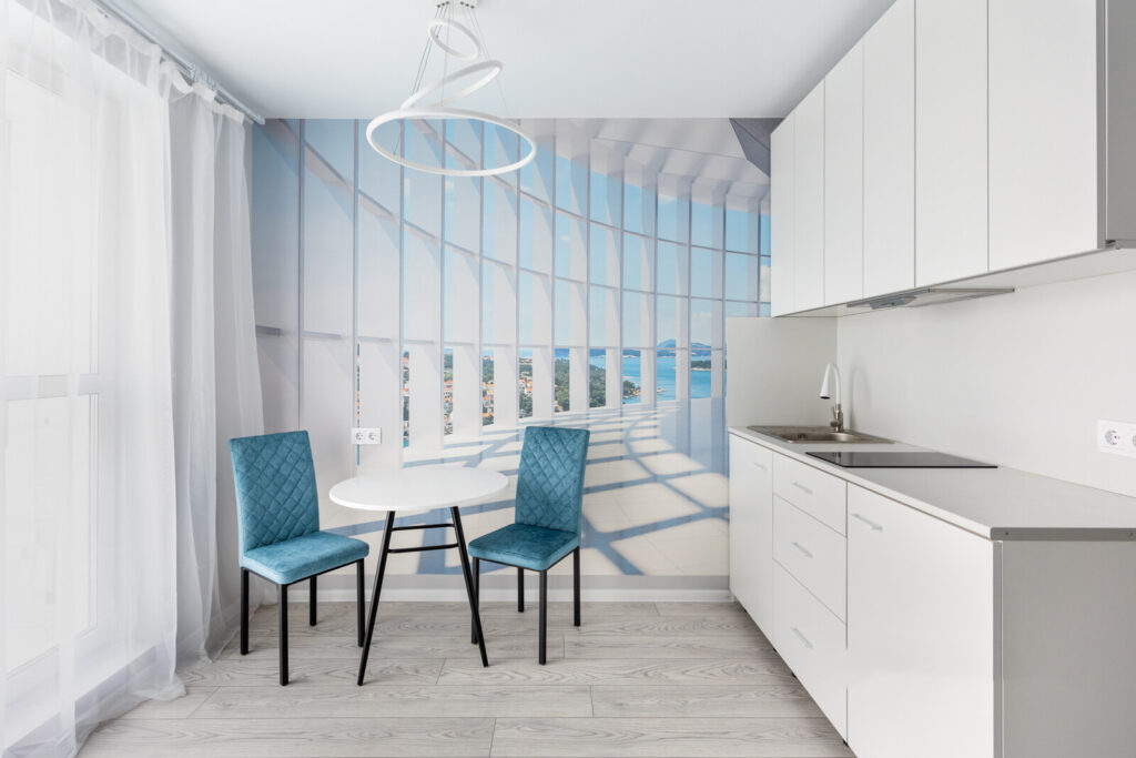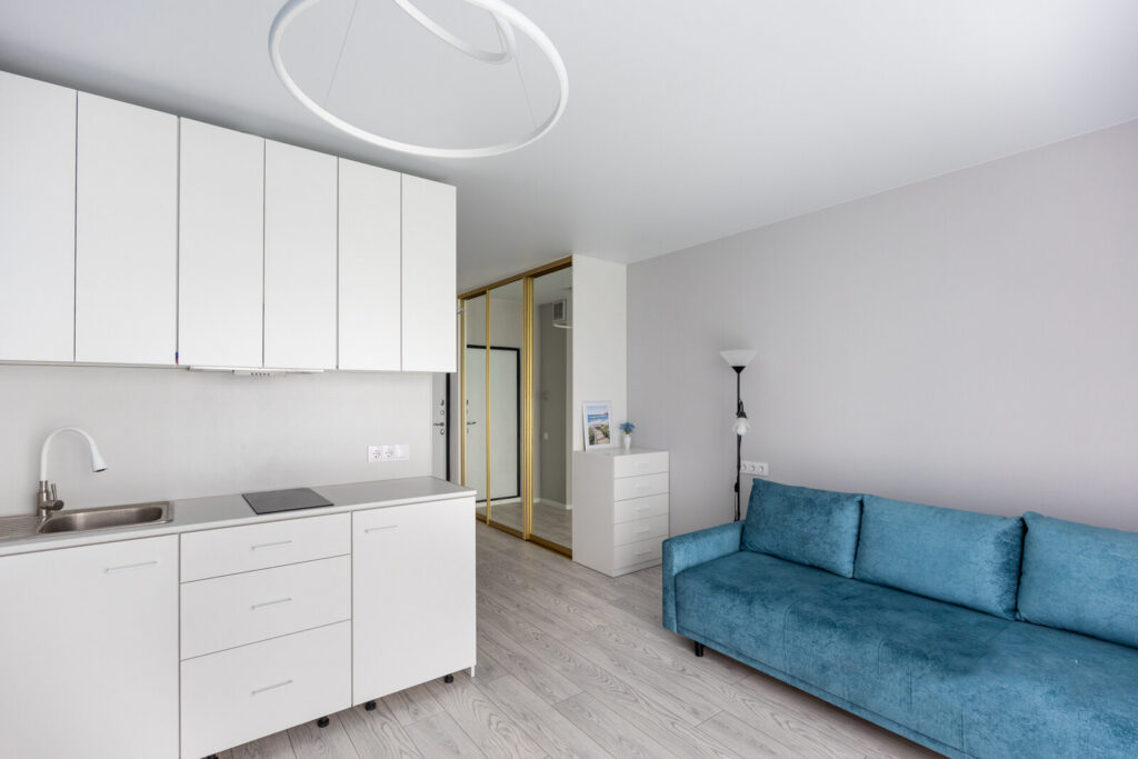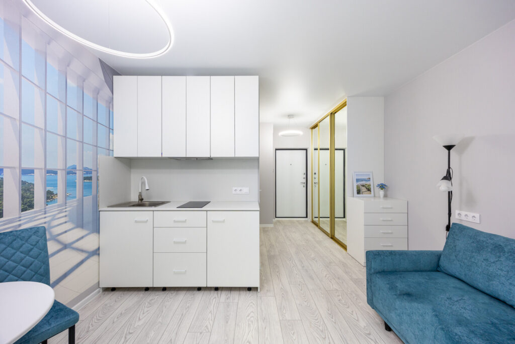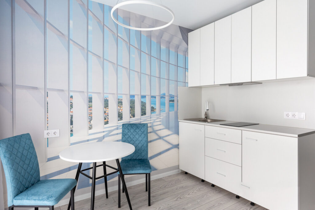 Площадь данной студии составляет 26 квадратных метров. Внутри квартиры установлен уютный кухонный уголок, а рядом с ним расположены эффектные фотообои, которые изображают живописные виды морского курорта. На полу — качественный ламинат.
