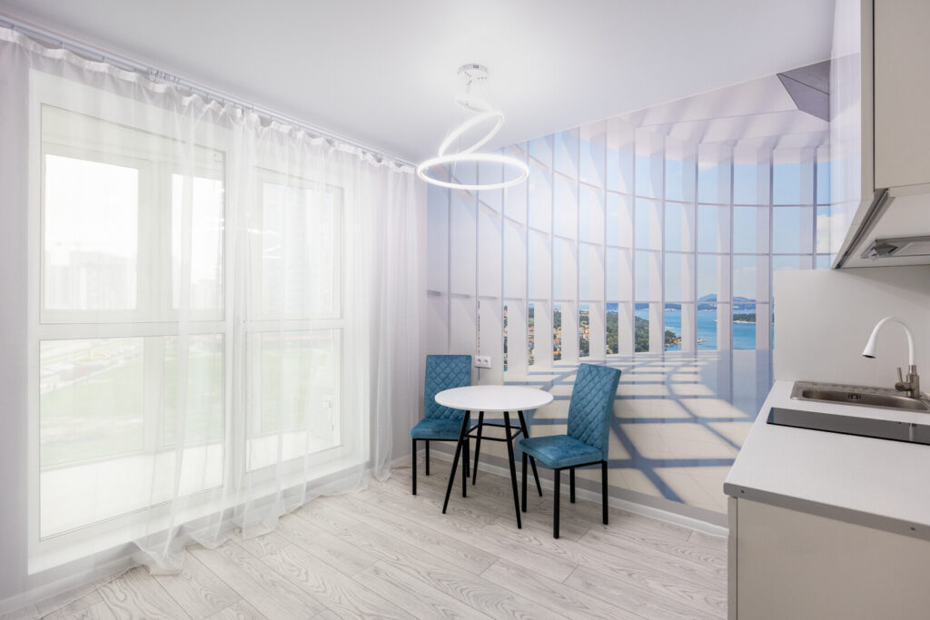 Планировка квартиры выполнена с умом. Кухня, в которой есть небольшая столовая зона, находится рядом с панорамными окнами. Диван, который также служит спальным местом, расположен на противоположной стороне от кухни.