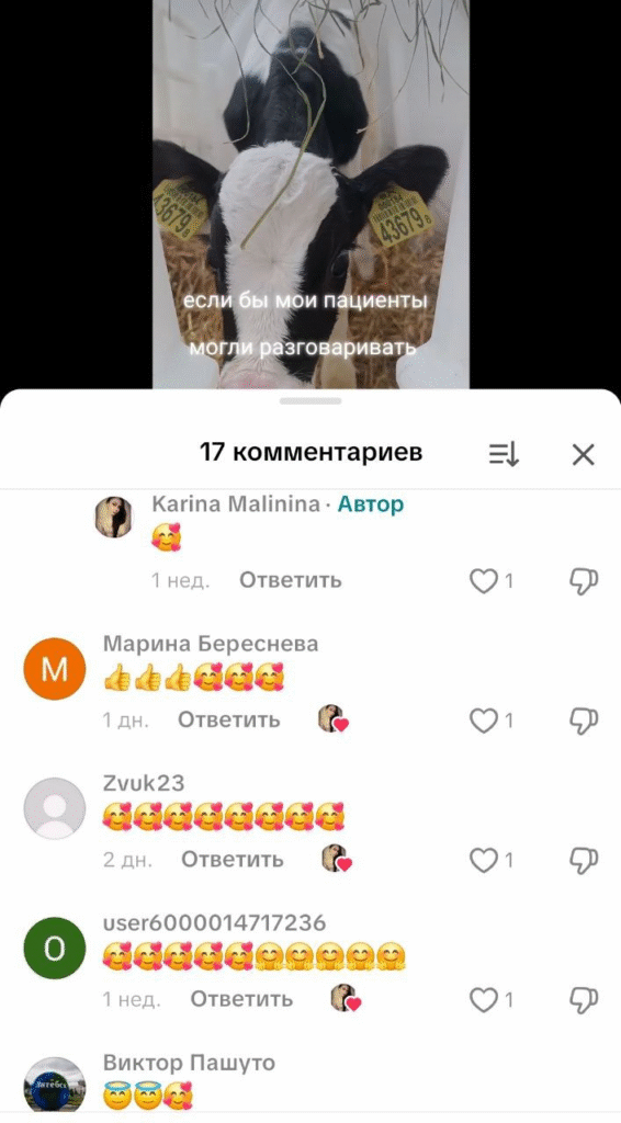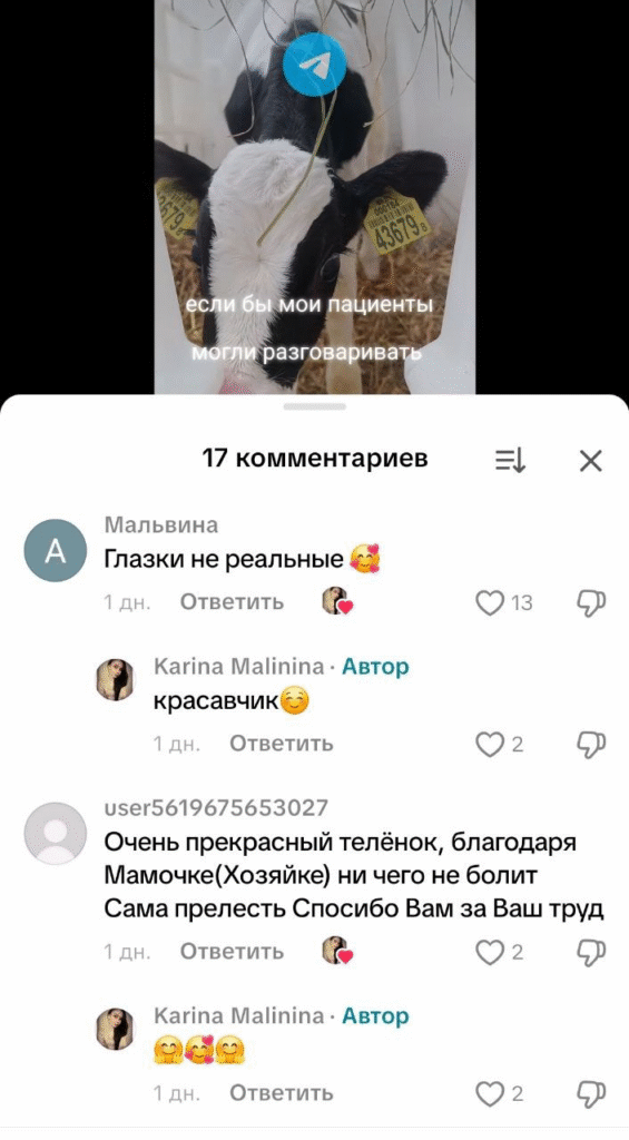 Карина Малинина известна поклонникам ТикТока как автор забавных видео с милыми телятами. Она работает на молочно-товарной ферме «Огородники» филиала Агрофирма «Лебедево», где и снимает ролики.