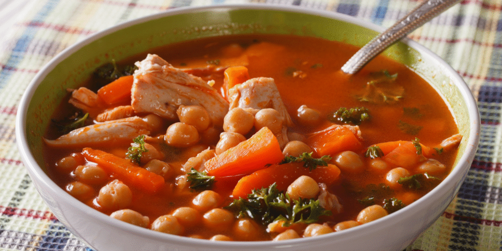 - Добавьте в кастрюлю нарезанную морковь и промытый нут. Залейте все горячим куриным бульоном. Доведите до кипения и варите на медленном огне 20-25 минут, пока курица не приготовится.