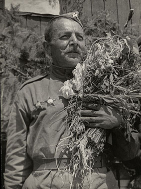 «Летом 1944-го мы перешли Проню, освободили Бобруйск, Могилев и вошли в Минск. Я впервые был в этом городе, и масштаб его разрушений меня потряс. Осталось всего ничего: чуть-чуть Немиги, Оперный, Дом офицеров… Люди вылезали из каких-то полуподвалов и трущоб, чтобы поприветствовать нас. Всюду — груды покореженного бетона и одинокие стены, которые раньше были домами. Вокруг Академии наук — колючая проволока. Надписи «Минный карантин» на редких уцелевших зданиях. Семьи с детьми, лошадьми, котомками и пожитками — их было жалко до слез. Не город, а территория ночного кошмара — в нем было больно дышать. Еще более страшные картины мы видели, когда освобождали узников лагеря в Озаричах, а потом в Могилеве. Вы встречали когда-нибудь глубоких стариков в возрасте 25—30 лет? А вот мне довелось… Одного из них запомнил на всю жизнь: Владимир Михайлович Мартынов из деревни Узники. У него было лицо Христа и глаза, которые хотели, но уже не могли плакать. «Иисус из Узников» — так я назвал этот снимок-образ».